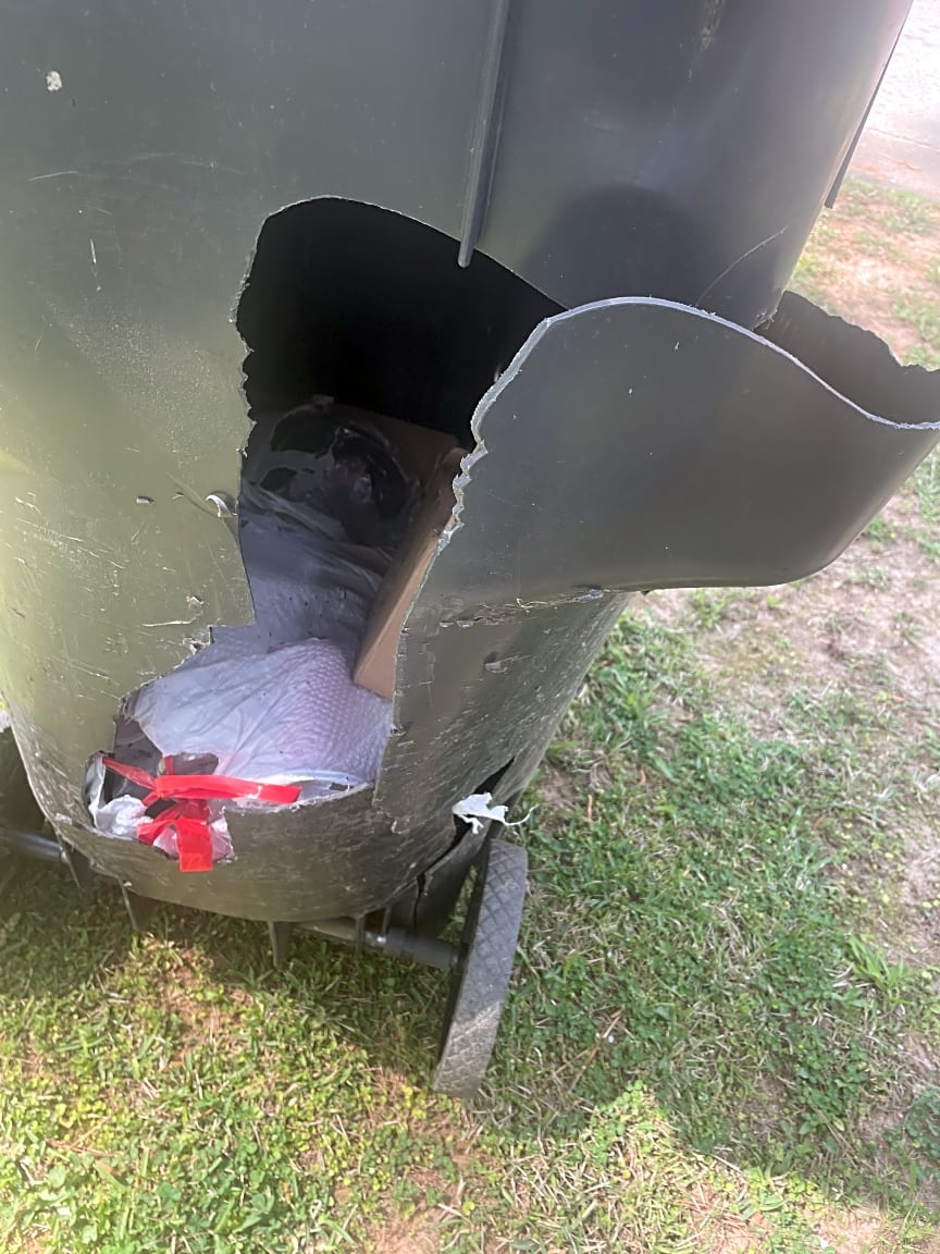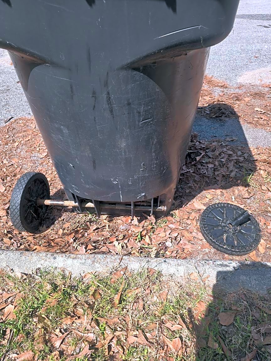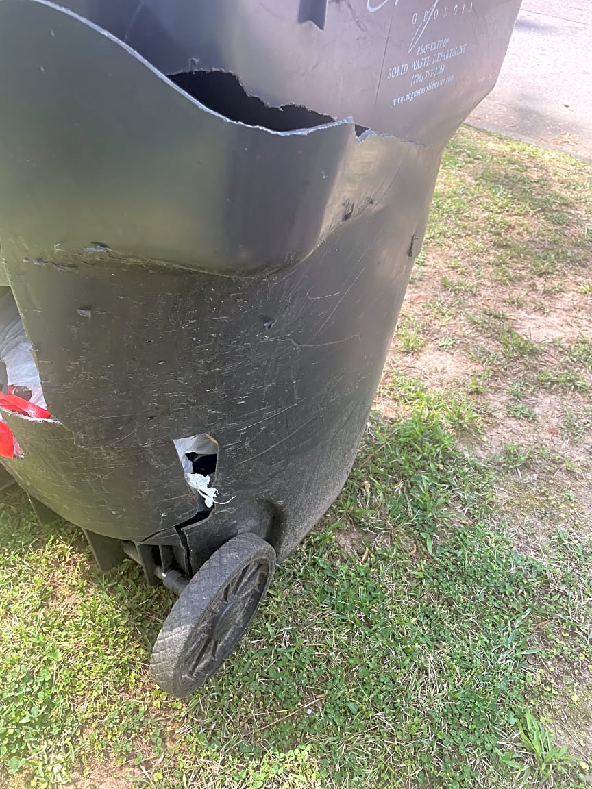 2149 Birch Ct, AugustaTrash picked up trash can and broke off the wheel when it was set back down. Wheel is broken on the trash can.